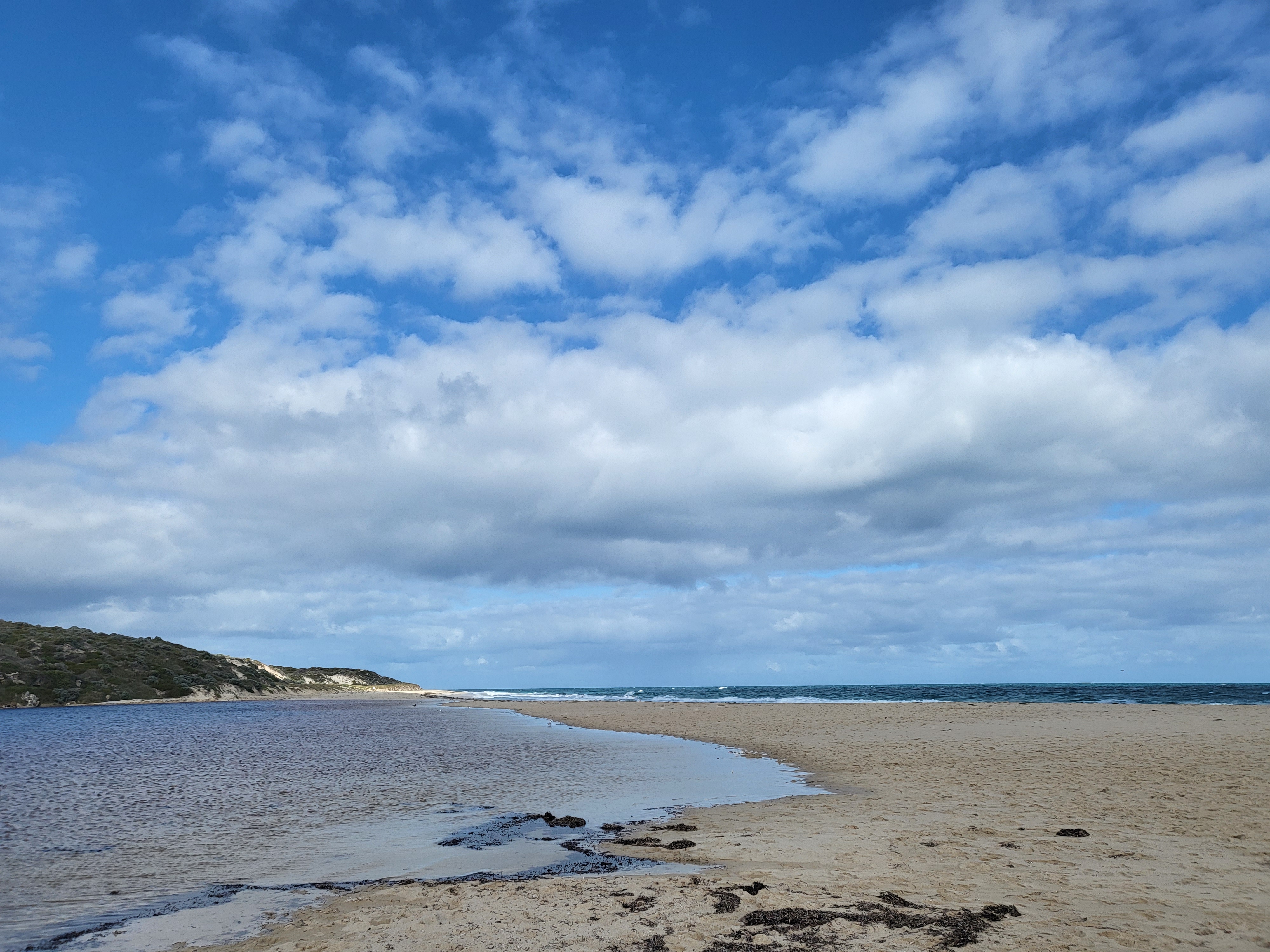 처음에는 무어강 주차장을 네비게이션으로 찍고 내려갔는데 이 곳은 주차비를 2달러 정도 내야하고, 무어강의 전경을 본다기 보다는 강 아래에서 레포츠를 즐기기 위한 곳인 것 같아서 다시 구글맵으로 'Moore river lookout'이라고 목적지를 정하고 나서야 비로소 원하는 지역으로 안내해 주었다. 주차장에 차를 대고 전망대처럼 생긴 곳으로 가니 드디어 강과 바다를 모두 볼 수 있으며, 바닷가로 내려갈 수 있는 계단도 있었다. 거친 바닷바람이 들이닥쳤지만 건조한 바닷바람은 한국에서 느끼던 그 찝찝한 바람에 비하면 선녀나 다름 없었다. 바닷가로 내려가 강물을 직접 만져보고 싶어 모래톱을 밟았다. 멀리서 볼 때는 짙은 빛이 감돌던 강물은 오히려 가까이 가니 푸르스름 한 느낌이었다.