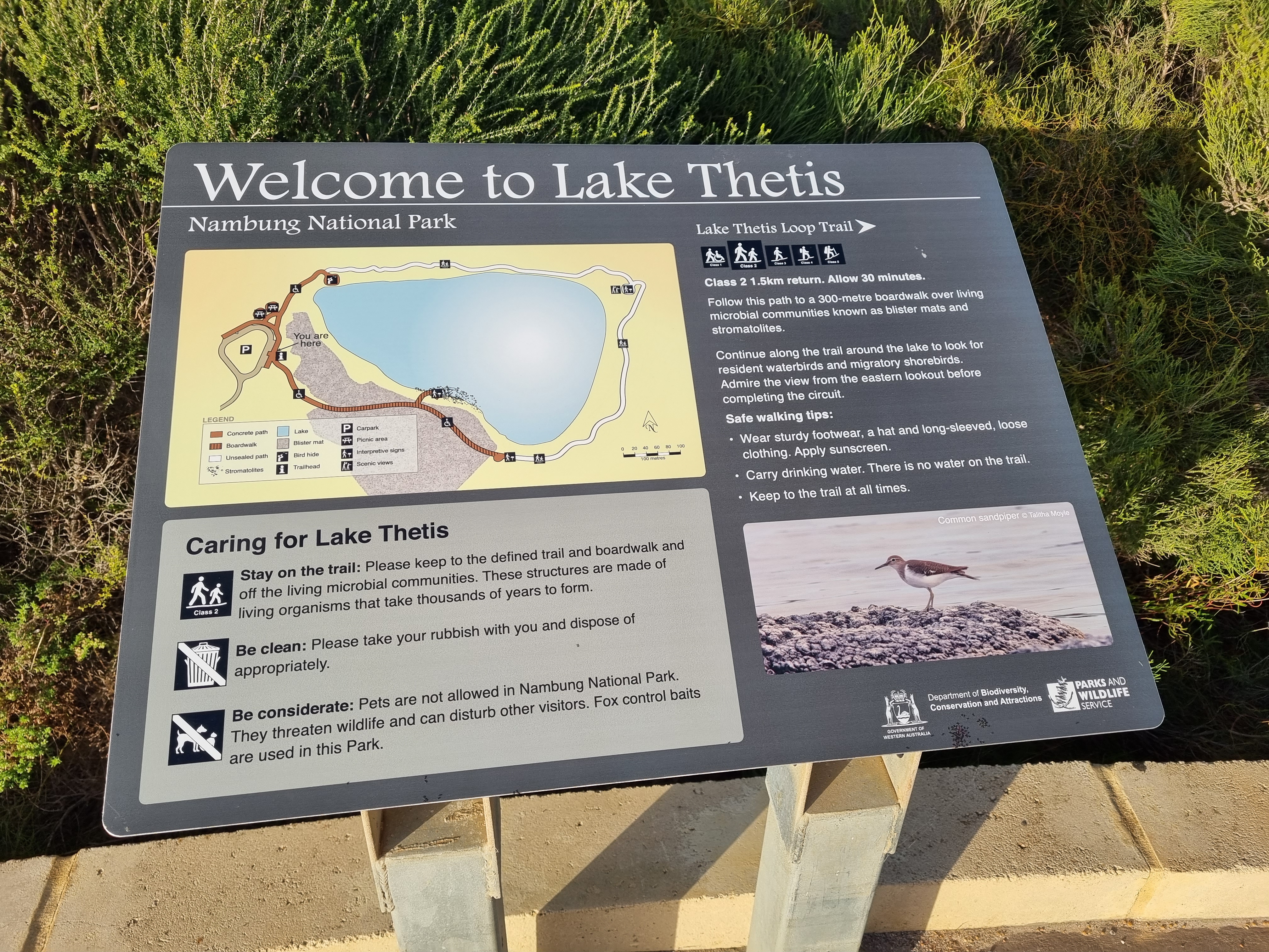 로드트립 첫째날의 마지막 목적지는 레이크 테티스 (Lake Thetis)이다. 별 것 없어 보이는 호수를 방문한 이유는 지구상에 유일하게 살아있는 스트로마톨라이트를 보기 위함이다. 스트로마톨라이트는 보기에는 그냥 돌같이 생겼지만 지구의 역사를 아는 사람들이라면 엄청난 가치가 있는 존재이다. 지구 상에 출현한 최초의 생명체 중의 하나로 남세균이 있는데 이 남세균이 생성한 부착물들이 겹겹이 쌓여 생성된 퇴적암의형태가 바로 스트로마톨라이트이다. 몇십억년의 역사를 담고 있는 것이기 때문에 지구의 역사를 연구하는 사람들에게 소중한 자료로 사용되고 우리나라에도 스트로마톨라이트의 흔적을 드물게 발견할 수 있다고 한다. 하지만 살아있는 것은 서호주에만 있는데 대표적으로 하멜린 풀 (Hamelin Pool)이라는 곳이 유명하지만 2021년 재해로 인해 접근할 수 있는 보드워크가 유실되면서 아직도 접근이 불가능하다고 하여, 궁여지책으로 레이크 테티스를 가기로 한 것이다. 하멜린 풀에 비하면 규모는 작지만 이 곳도 아직 살아있는 스트로마톨라이트가 서식 중이었다. 남세균이 서식을 위한 조건으로 고염도의 물이 필요한데 이러한 조건을 갖춘 지역이 바로 이 곳과 하멜린 풀인 것이다.